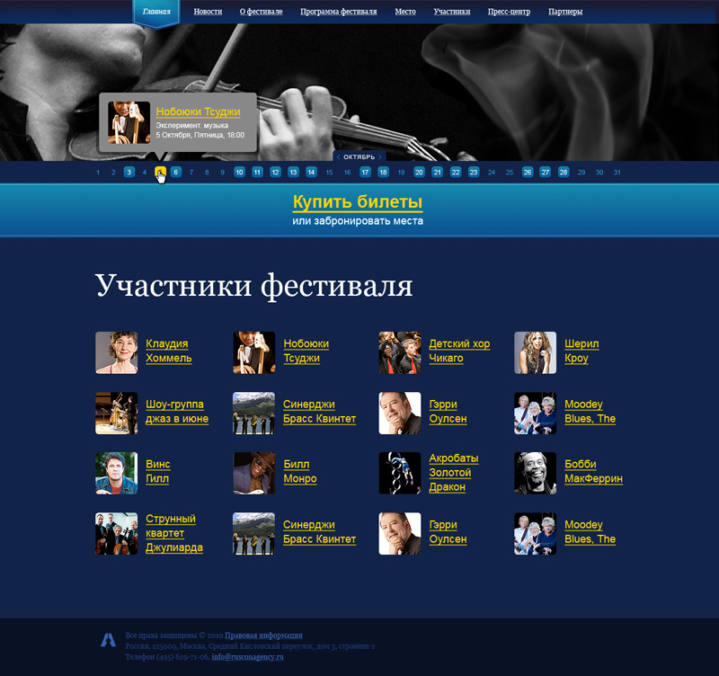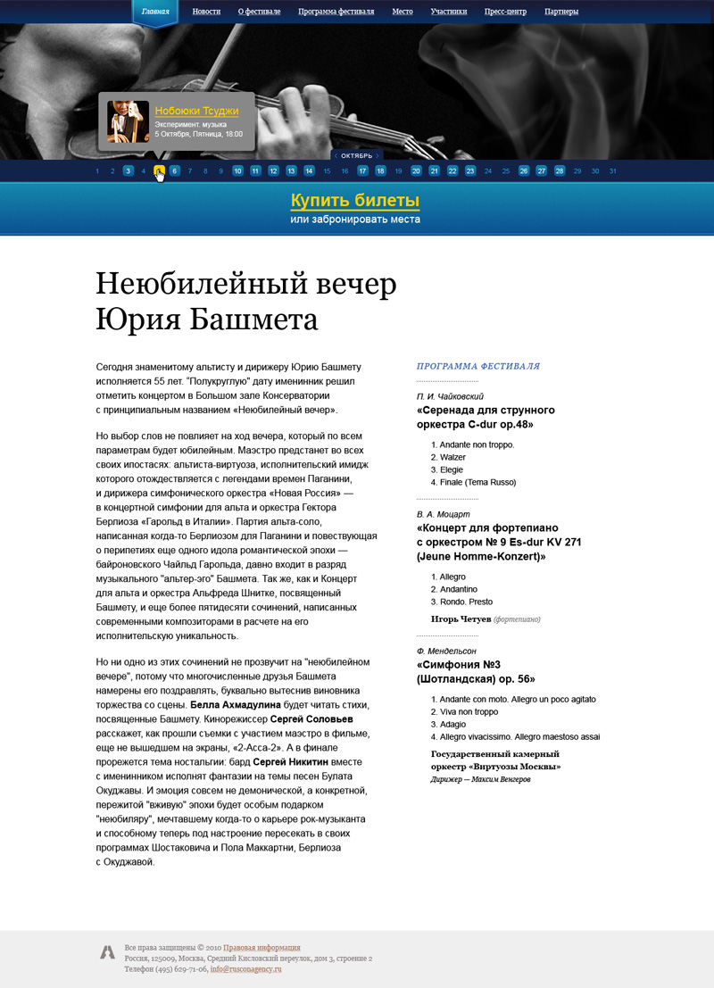 Задача: Разработать концепцию дизайна для сайтов проектов Русского Концертного Агентства, которую можно будет использовать с минимальными изменениями для различных концертов, фестивалей и т.п. мероприятий.