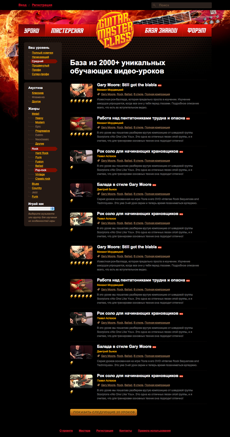 Главное преимущество проекта - это качественный материал. Все уроки классифицируются по жанрам, стилю, уровню пользователя. Есть возможность поиска уроков по исполнителю. Для удобства поиска все уроки снабжаются тегами.