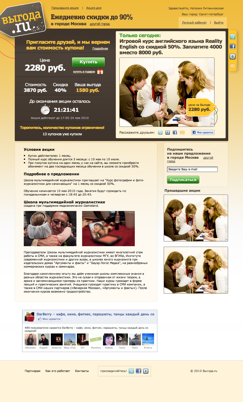 Для «Выгода.ру» нашей командой проделан большой комплекс работ. Начиная от верстки нового дизайна проекта, предоставленного заказчиком, интеграцией его в существующий движок. И заканчивая большим количеством функциональных доработок, исправлением ошибок.